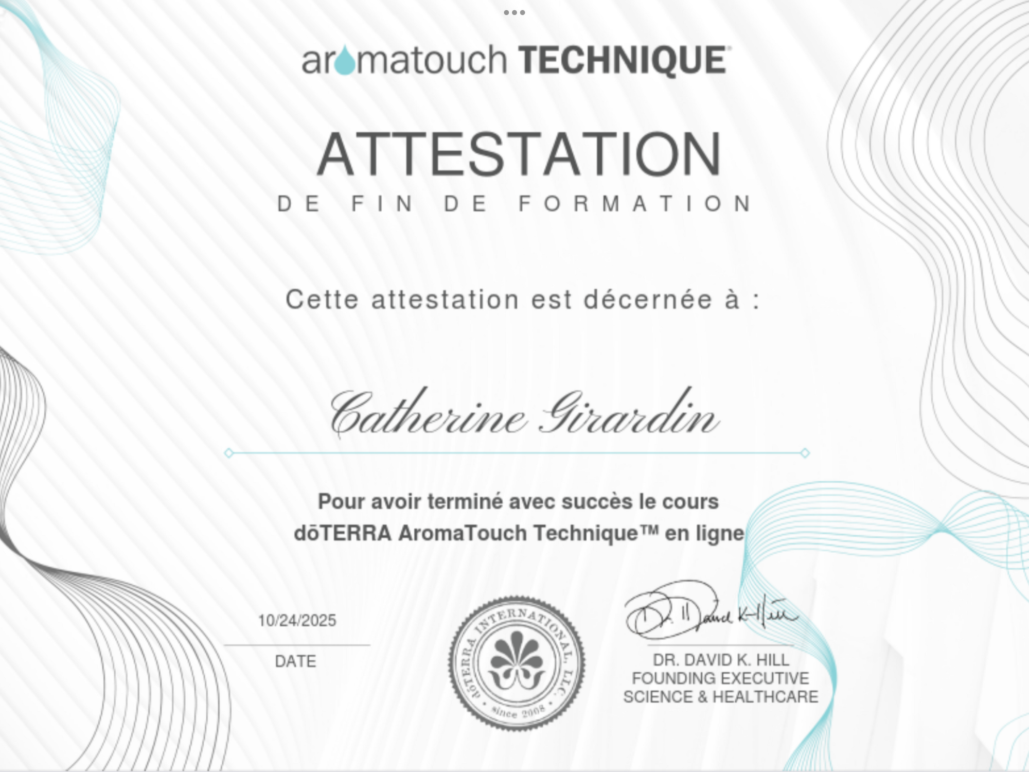 Cette technique douce et enveloppante créée par le dr David Hill associe le pouvoir des huiles essentielles doTERRA à un toucher délicat pour rétablir l’harmonie entre le corps et l’esprit .